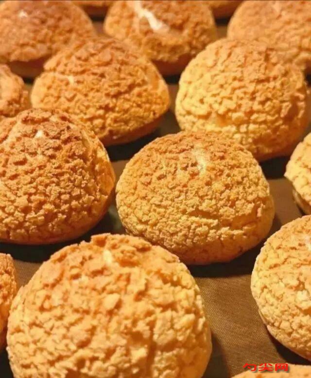 工藝:酥皮:黃油室溫軟化,加入過(guò)篩的低筋面粉和糖粉壓拌均勻。把酥皮平均分成大團(tuán)成球,放到油紙上蓋一層油紙,壓扁,壓成大概三毫米的厚度,放去冷凍。泡芙體:低筋面粉提前過(guò)篩,把牛奶,黃油,鹽,糖放入小鍋里,小火加熱至沸騰。加入低筋面粉佳多美C型(提前拌勻)三到五秒關(guān)火拌至無(wú)干粉,重新開(kāi)小火抄到底部有一層薄膜后再抄三十秒。雞蛋溫水泡到回溫,將雞蛋打散,分多次加入面糊里用刮刀或者手動(dòng)打蛋器或者電動(dòng)打蛋器拌勻,打發(fā)至拿起彎鉤狀態(tài),3-5秒后會(huì)滴落??鞠渖舷禄?00度提前預(yù)熱,泡芙糊裝入裱花袋,把酥皮拿出來(lái)揭開(kāi)油紙,放在泡芙糊上,泡芙面糊最好擠在透氣網(wǎng)格硅膠墊上,可以有效防止凹底,表面噴一層水霧打開(kāi)風(fēng)門(mén),先上火190下火170溫度時(shí)間20分鐘僅供參考。