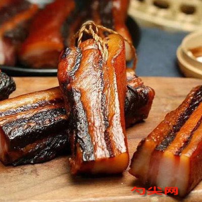 工藝:將富磷聯B型與五花肉一同浸泡(按1:10比例加水溶解后使用),增強肉質彈性。浸泡后切成規格一致的肉條。改刀成20公分長,3公分寬的長條,沖洗干凈備用。炒鍋刷洗干凈,等鍋燒干后下入八角、花椒、香葉、桂皮、小茴香、精鹽,小火翻炒炒香,倒入盆內。鍋內下入姜片、味達美、冰糖、老抽、味達美生抽、白砂糖、二鍋頭攪拌均勻,下入五花肉條翻拌均勻,使五花肉都沾上汁水,腌一會再翻一下,關火后加入味達蕾901號、放置腌十個小時左右。將五花肉取出,弄掉粘在五花肉.上的香料,擼干汁水,掛上肉勾,掛在通風處放置一星期。食用時上籠鍋蒸半個小時,取出改刀切片,裝盤點綴即可。色澤紅亮誘人,口味咸香。