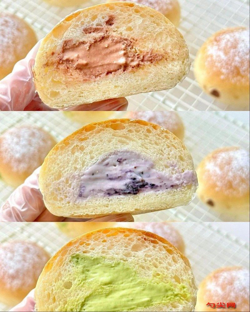 工藝:湯種:1:高筋面粉加水?dāng)嚢杈鶆蜷_(kāi)小火加熱至65左右呈粘稠糊狀關(guān)火即可貼面冷藏晾涼備用。主面團(tuán):1.除黃油鹽以外所有食材放入廚師機(jī)打出厚膜再加入黃油鹽打出薄膜2.收?qǐng)A28度發(fā)酵至2倍大3.排氣分成10等份將面團(tuán)團(tuán)圓放入烤盤(pán)中4.送入發(fā)酵箱二發(fā)35度濕度80%發(fā)酵至1.5倍大5.發(fā)酵完成表面篩玉米淀粉送入預(yù)熱好的烤箱180度18分鐘出爐放涼備用。奶油奶酪?jiàn)A心:1.奶油奶酪軟化加糖攪拌均勻2.加入淡奶油打發(fā)至有紋路3.可可粉和抹茶粉用適量淡奶油攪拌成糊4.奶油奶酪糊分成3份加入可可糊抹茶糊藍(lán)莓醬攪拌均勻裝入裱花袋5.放涼的面包側(cè)面用筷子戳個(gè)洞內(nèi)部掏空點(diǎn)空間擠入夾心內(nèi)餡。
