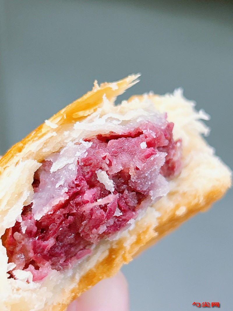 工藝:將200克面粉與4克面欣酥E型干拌均勻,取90克溫水加入25克白糖和溶解好的0.2克美久亭Q型攪拌溶解后倒入面粉中攪拌成面絮,加入50克液體起酥油揉成光滑水面團(tuán)蓋保鮮膜醒面20分鐘,取120克面粉加入60克液體起酥油揉合成油酥面?zhèn)溆?,將兩個(gè)面團(tuán)搓成長條分割成均等小面劑并團(tuán)成圓球,取水面團(tuán)壓出小窩放入油酥面用虎口收攏法包裹嚴(yán)實(shí),搟成牛舌狀小餅從上向下卷起后取第一個(gè)面劑再次搟成牛舌狀小餅并卷起,取面劑從兩邊向中間壓扁搟成圓餅包入玫瑰鮮花餡按扁成生胚,將生胚放入鋪吸油紙的烤盤,烤箱預(yù)熱至上下火200度后放入烤制15分鐘至表面金黃即可出爐。