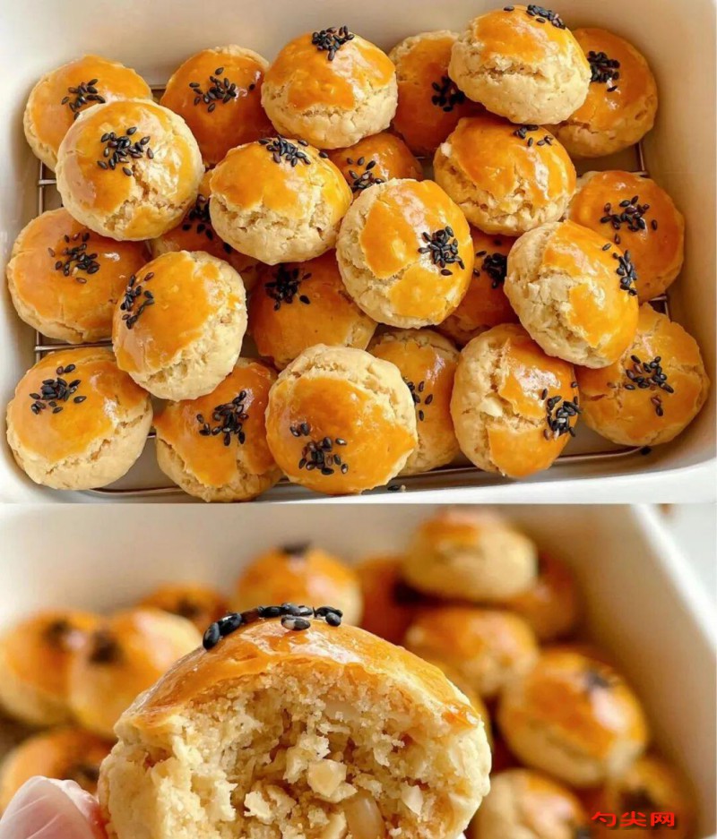 配方:玉米油65克、全蛋液50克、糖粉35克、鹽1克、低筋面粉160克、面欣酥F型2克、即食燕麥片40克、花生碎50克。蛋黃1個、白芝麻或黑芝麻適量。