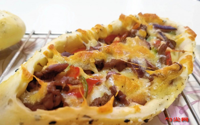 配方:面團:高筋粉250g,佳多美Q型3g,冰水150g,鮮酵母7g,鹽2g,橄欖油15g,花椒葉2g,裝飾:蛋液,黑芝麻,白芝麻,芝士粉,黑胡椒碎,馬蘇里拉芝士,內餡材料:牛肉,洋蔥,彩椒,蠔油,味達蕾901號,生抽,鹽。