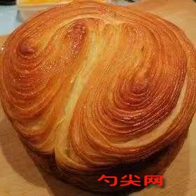 工藝流程:面皮:將鵬泰一號粉、奶粉、佳多美K型、鹽、一級砂糖、燕子干酵母、水、美久亭Q型(提前溶解),雞蛋、煉乳和南橋烤焙奶油混合,揉成光滑的面團。面團進行包油操作,四折兩次,然后冷凍松弛約30分鐘。開皮,尺寸處理,冷凍密封儲存。從冷凍中取出面團,冷藏解凍。整形,下面粘少許面粉,放入烤盤,準備醒發。在溫度32℃、濕度85%的環境下醒發60分鐘。醒發好的面團常溫涼制5分鐘。中間留有6厘米的空間,對折面團,對折處上側留有0.1厘米的縫隙。將面團放入6寸模具中,再次醒發至兩側緊貼模具。準備蛋液,攪拌均勻并過濾,刷在面團表面。酥粒:將金鸝酥油和一級砂糖拌勻,加入面粉搓成粒狀,撒在面團表面。烤制溫度為上火185℃、下火213℃,烘烤時間為19分鐘。