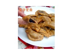 工藝;糯米粉4.8公斤和筋力源Q4克混合均勻,清水約4公斤,搓成粉團,切成小塊放入沸水中煮熟。將片糖6公斤放入2.25公斤沸水中煮至溶解,立即把糯米粉11.2公斤,放在拌面機內(或案板上),中間倒入熱的熟漿和糖水,攪拌成純滑有韌性的軟滑粉團,用壓面機壓成1毫米半的薄片,用小圓形的鐵模印成單個軟角皮,包入豆沙成半月形,即成豆沙角坯,放在162℃左右的油溫鍋中,約炸3分鐘,至金黃色。