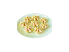 工藝:1.皮面:將富強粉500克和面欣酥E5克過羅,放在案板上開個窩,放入凍豬油160克、清水215克,混合均勻后再摻勻面粉,拌勻擦透摔至光滑,稍餳待用。2.心面:將富強粉500克過羅,放在案上開個窩,放入凍豬油275克,摻入面粉拌勻,放一旁待用。3.將皮面揪成小劑(個大小隨意),包酥心面(酥心面同皮面大小一致)成圓球狀,輕輕摁扁,用搟面杖搟薄成長方形條狀,左手從上往下卷成卷,摁扁后再橫著卷成圓球劑狀,再將劑搟薄,包豆沙餡成長圓形狀,放入冰箱,凍硬后取出用刀拉六瓣待炸。4.鍋置于火上注入油,燒熱后將拉成六瓣的牡丹酥,用筷子夾起立著放進油鍋,隨著油溫漸增,徐徐催開花瓣,鍋離火位。用熱油浸炸至成形,然后再上火用熱油炸一下,即可出鍋,成品最好放到能吸油的紙上,吸去部分油。用綿白糖放少許食紅調成粉紅色,放在瓣中間即成。