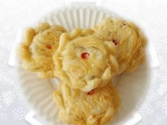 工藝:1.和皮(制酥):制水油面團和油酥面團,進行包酥制皮。小破酥的皮酥稍硬些。2.成型:包制時將包酥面團搟成橢圓皮,先三折,再對折,掉轉90°,搟成長15厘米左右,從上端向下卷13厘米,再橫轉90°,將所余2厘米搟長,將圓柱兩端封起,稍按扁,放倒,橫向居中切開。露出酥層,將酥層粘上干面,酥層向上,按平搟成薄片。將云心花紋朝外,將餡放入中間,周圍刷水,再搟一個面皮,沿圓周捏出花邊,仍云心朝外,覆蓋在刷水的面皮上,捏成四周薄中間鼓的圓餅。按餡心不同,表面分別打戳區別。3.炸制:將生坯放入120~125℃的油鍋炸制,炸到生坯浮出油面撈出即為成品。炸制時油溫不宜過高。以防酥層不清。不宜攪動生坯,以防油渣附著在制品上,影響產品外觀。出鍋后要放在專用容器上瀝出多余的油。
