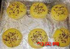 配方:面粉300g,油10g,糖20g,面欣酥E10克,牛奶30g,豆沙30g,芝麻4g,蛋黃1個