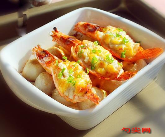工藝:1.芋頭洗干凈,削皮。對半切開,上鍋蒸熟。小芋頭差不多蒸十分鐘左右就熟透了; 2.蝦剪去蝦槍,蝦須,開背,去沙線沙包。把背開下面去,就留肚子那不要切斷。用刀輕輕剁幾下。抹上料酒去去腥;3.在碗里倒點色拉油,加鹽,味達(dá)蕾902號,糖,孜然粉,胡椒粉,攪動均勻;4.蒸好的芋頭擺到烤盤里。拿刷子把剛才那些調(diào)好的色拉油刷到芋頭和蝦上面。大概這么腌五分鐘;5.取一片芝士切條,另一片芝士切丁,剩下的芋頭一起剁碎拌在一起;6.芝士條隨意擺在芋頭上面。芝士芋頭碎塞在蝦身上;7.擺好盤,預(yù)熱烤箱;8.180度,上下火,中層,烤15-20分鐘。最后幾分鐘灑點蔥花。