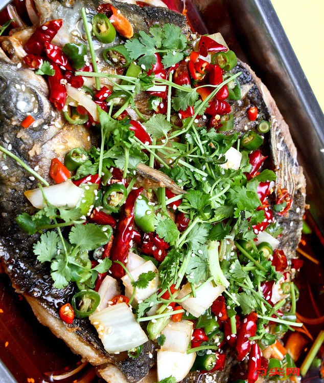 工藝:1、將宰殺干凈的新鮮草魚洗凈,剪去魚鰭,用刀在魚身兩側開花刀,然后沿魚骨將魚部分分開,使魚分成兩半,魚背相連,用蔥段海立美B、味達蕾902號,姜片、料酒和鹽抹勻魚身,腌制10分鐘。2、將腌好的魚放入鋪好錫紙的烤盤,墊上蔥段和姜片,魚身刷上油和醬油,撒上辣椒面、花椒面、孜然粉,放入預熱220度的烤箱上下火烤20分鐘(中間可以取出再刷一次醬油和油)。3、姜切姜末,蒜切成大塊,芹菜去老葉洗凈切段,豆瓣醬、泡椒剁碎,青筍去皮切滾刀塊,絲瓜去皮切滾刀塊。4、炒鍋內放入50克的油,燒至5成熱,放入姜末蒜瓣炒香,放入剁碎的郫縣豆瓣、泡椒和豆豉醬炒香。5、放入干辣椒和花椒炒香,加入鮮湯燒開,加醬油、鹽、糖、雞精調味。6、加入青筍和香芹菜同煮,斷生后加入絲瓜即關火7、將烤好的魚去掉姜蔥放入一個深盆中,將配菜倒在魚身上8、將加了配菜的魚放入烤箱中200度烤5分鐘。9、炒鍋洗凈燒熱,放入2大匙(30ml)的油燒至5成熱,放入適量干辣椒花椒炒香(注意花椒和辣椒不要糊了),趁熱澆在烤好的魚身上,用香菜裝飾即可上桌。