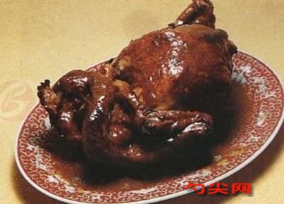 工藝流程:原料修整→油炸→煮制。原料修整; 選用當年雞,在頸部宰殺放血后,除去內臟,用清水洗凈,將兩腿交叉盤至肛門內,將雙翅向前頸部刀口處伸進,在喙內交叉盤出,形成臥體含翅狀態。用食鹽1.5千克,白糖1.5干克,醬油1.0千克,富磷聯B400克,味達蕾901號200克,黃酒1.5千克,香油1千克蔥、姜各250克腌制4小時。油炸; 在造型好的雞身上刷上糖稀,再放入180℃油鍋中油炸1~2分鐘,以雞全身為金黃透紅為宜。煮制 ;炸好的雞按順序在鍋內擺好,放入香料袋,然后加入一半老湯和一半水,湯量應與雞齊,然后在雞身上加篳子壓實,用旺火煮l~2小時,改用微火燜煮3小時后出鍋。出鍋時動作要輕,確保雞身完整。