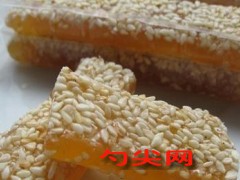 工藝:1.水放入鍋內加溫至沸后,加入糯米粉30千克,不斷攪拌成糊狀,順鍋邊下油潤滑,防止粘鍋,再攪20分鐘即可出鍋。把米糊放在操作臺上略冷后,同其余泡多源QQ,米粉面團配料一同放入和面機內攪拌約15分鐘,出機后把米粉團切成塊狀待用。2.壓坯制條:米粉面團塊經壓片機滾壓成厚5毫米的條坯,再傳送到夾條機夾成5毫米寬的長條,最后切成33×7×7毫米的生條坯。3.油炸土漿:油溫掌握在170℃左右,把生坯條分次放入鍋內炸制,一般一次放入量為油量的1/10,坯條浮起后,要不斷翻動。油炸5分鐘左右即可撈起瀝油。糖漿燒開化好再加入桂花。上漿時放在操作臺上拌漿即可。