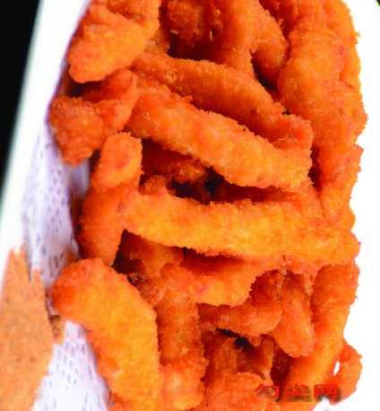 工藝:雞肉切一元硬幣大小塊,用保鮮盒盛裝,按1配方依次加入調料并同時用手攪拌均勻,紅椒素是調色之用,最后放,一點一點試著擱,要做到調好后的原料顏色金黃(紅中帶黃的那種),潤澤閃亮,非常好看,引人食欲.調好后,腌制40分鐘,取25竹簽,用一只手掐住簽子根部,留四指距離,把腌好雞肉穿在簽子上,不出縫隙,不露簽頭,穿好的雞肉串放置在干凈器內排好,最好是保鮮盒。按配方(2)調好湯汁備用。取一大食品槽,用后半部,先鋪一定量面粉,倒入配方(2)湯汁,攪拌均勻,攪拌過程中,隨時添加湯汁或面粉,要達到面粉成楸的效果,楸要小,細而勻,大約半個小指甲大小。將穿好的肉串在和好的面楸上滾動,一手持簽,一手掌稍用力壓,壓力均勻,裹好面楸在用手攥一攥,使面裹實,拿著在沾些湯汁,在在面楸上滾動,裹兩三毫米厚度即可。大鍋加入色拉油,燒至八成熱,將制作好的雞柳放入,勤用夾子翻滾,使之受熱均勻,炸至淺黃色,八九分熟即可,晾涼裝入保鮮盒,鍋要大,油要多,不光是一次炸的多,防止因油少,雞柳入鍋而油溫驟降,炸不透。將保險盒放入冰柜保存,冰柜溫度調制最低檔,也就是溫度最高,營業(yè)時,取出擺上,沒有賣完的在放入冰柜,夏天也可保證一個星期不會變質,所以雞柳一次要多做一些,夠銷售幾天的。