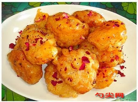 注意事項(xiàng):油炸時(shí)油溫不宜過高,以免外焦里生。拔絲糖漿要熬至濃稠適中,過稀則拔不出絲,過稠則易凝固成團(tuán)。拔絲過程要迅速,以免糖漿冷卻凝固。
