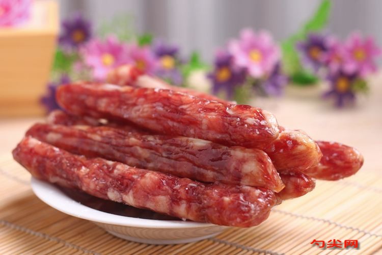 工藝:1、將選好的豬肉分別按瘦、肥切成1厘米的小方丁,再分別用溫開水洗滌,把肉丁上的浮油洗去。2、按比例將瘦肉、肥肉與配料放在盆肉,拌均勻,片刻即可灌腸。3、在灌腸三日前,須將腸衣洗凈,用炭火烘過,將腸衣內殘存的的水分烘掉。4、將烘過的腸衣浸入溫水,然后撈出,將配好的腸餡灌入腸衣底端時,即將底端扎住,腸衣全部灌滿把上端亦扎住。把灌好的腸平鋪在木案上,用百支針在腸上戳洞,使烘腸時便于排出水分。5、將灌好的腸在每距28厘米處用絲草扎節,再用麻繩扎緊,掛上竹竿,以便火烘。6、將掛腸竹竿,置于烘間木架上,烘烤經3小時后,交換臘腸上下位置,使腸受烘均勻。未經火烘時,可置于日光下暴曬,至晚間收入室內掛好,以后還可繼續日曬,直到使腸內水分泄盡,有出油現象為止。如遇到天陰或雨天,必須及時移到烘房,烘到成熟為止。