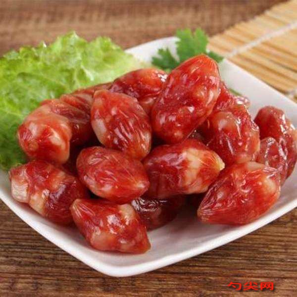 工藝:1.選料及整理;選新鮮純瘦肉,按灌制香腸的要求將瘦肉整理好。再將瘦肉割成約250克重的肉條,投入5毫米孔眼的絞肉機內絞碎。2.制餡和灌制:將配料放入容器內混合在一起,再把已絞好的肉餡放入其內攪拌均勻,直到肉餡粘稠時為止。肉餡攪后灌入經洗凈的腸衣內。用繩結扎成每個約3~厘米大小紅棗樣的形狀,要緊密無間隙,腸內無貯積的空氣。3.風干及煮制:將肉棗成串的掛在干燥通風處風干。春秋兩季風干15天左右,風干程度以指壓有彈性、腸衣干燥有褶皺為宜。風干后的棗要用溫水洗刷干凈,然后放在鍋內煮15分鐘左右,水溫在86~90℃之間。