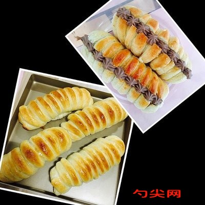 工藝:1.參照“和面流程”,將除黃油以外的面團原料放在一起,揉至面團表面光滑,能拉出比較厚的膜。2.加入黃油,揉至完全階段,面團能拉出薄且不易破的膜。3.參照“直接法面包制作流程”,將面團放在溫暖處進行基礎(chǔ)發(fā)酵。基礎(chǔ)發(fā)酵結(jié)束后,將面團取出,輕壓排氣,分割成60克/個。4.將面團滾圓,松弛15分鐘。5.將松弛后的面團搟成橢圓形,翻面后放上卡仕達奶油,將面團對折,封好口。6.將面團排在烤盤上,用剪刀在面團封口處剪3道口。7.將面團放在溫暖濕潤處進行最后發(fā)酵。8.最后發(fā)酵結(jié)束后,在面團表面刷全蛋液。9.將面團放入預(yù)熱至180℃的烤箱,中層,上下火,烤15分鐘。