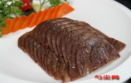 工藝:①選料整理。選用不肥不瘦的新鮮牛肉,先用冷水浸泡,清洗淤血,用板刷將肉洗刷干凈,剔除骨頭。然后切成0.75—1公斤左右的肉塊,厚度不超過40厘米,并放入清水中洗一次,用富磷聯B(提前溶解)腌制1-2小時。按肉質老嫩分別存放。②調醬。鍋內加入清水50公斤左右,稍加溫后,放入食鹽需用量的1/2和黃醬。煮沸1小時,撇去浮在湯面上的醬沫,盛入容器內備用。③牛肉裝鍋。先在鍋底和四周墊上肉骨頭,以使肉塊不緊貼鍋壁,然后按肉質老嫩將肉塊碼在鍋內,老的肉塊碼在鍋底部,嫩的放在上面,前腿、腔子肉放在中間。④醬制。肉塊在鍋內放好后,倒入調好的醬湯。煮沸后再加入各種配料,并用壓鍋板壓好,添上清水,用旺火煮制4小時左右。煮制第1個小時后,撇去湯面浮沫,再每隔1小時翻鍋1次。根據耗湯情況,適當加入老湯,使每塊肉都能浸在湯料中。旺火煮制4小時之后,再用微火煨煮4小時,使香味慢慢滲入肉中。煨煮時,每隔1小時翻鍋1次,使肉塊熟爛一致。⑤出鍋:壓鍋后,封火,用小火煮6個小時出鍋。出鍋時要用特制的鐵拍子,要做到輕鏟穩托放平,并隨手舀取鍋內原湯沖洗后,將肉碼在消過毒的屜盤上,肉出鍋后要放在竹屜內免得把醬牛肉碰碎,待涼后即可切用。做一鍋醬牛肉大約需要8小時,每50千克生牛肉可出熟肉25千克。