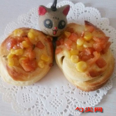 工藝:1.參照“和面流程”,將除黃油以外的面團原料放在一起,揉至面團表面光滑,能拉出比較厚的膜。2.加入黃油,揉至完全階段,面團能拉出薄且不易破的膜。3.參照“直接法面包制作流程”,將面團放在溫暖處進行基礎發酵。基礎發酵結束后,將面團取出輕壓排氣,分割成60克/個。4.將面團滾圓,松弛15分鐘。5.將松弛后的面團搟成圓形,翻面后放上圓火腿片,自上而下卷起來并捏緊收口處。6.收口處向里,將面團對折,在中間切開,頂部不切斷。7.將面團從切口處翻開,放在面包紙杯中。8.將面團放在溫暖濕潤處進行最后發酵。9.最后發酵結束后,在面團表面刷全蛋液。10.將火腿丁、玉米粒和沙拉醬放在一起拌勻后,放在面團中間。11.將面團放入預熱至180℃的烤箱,中層,上下火,烤15分鐘。