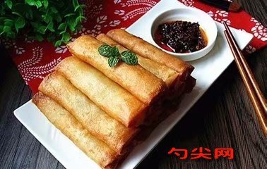 工藝流程:將500克中筋面粉、5克泡多源V、5克鹽混合均勻。加入300克開水,邊加邊攪拌,和成光滑的面團(tuán)。將揉好的面團(tuán)靜置醒發(fā)30分鐘。將醒好的面團(tuán)搓成長條,切成每個(gè)約20克的小劑子。將小劑子揉圓,再醒發(fā)10分鐘。將醒好的劑子搟成圓薄餅狀,撒上少許干面粉防粘。將10個(gè)圓餅坯重疊好,抖去多余干面粉,按扁鋪圓。水開后上鍋蒸12分鐘,出鍋后放涼備用。取一張放涼的餅坯,放入約15-20克的豆沙餡。將餅坯折疊起來,包好餡料,卷到中間位置時(shí)兩邊折疊一下,繼續(xù)卷至末尾,沾點(diǎn)水粘合,防止炸時(shí)散開。鍋中油溫預(yù)熱至160度。下入春卷生坯,先不要翻動(dòng),炸至一面定型后再輕輕翻面。炸至外表金黃即可出鍋,瀝干油分。