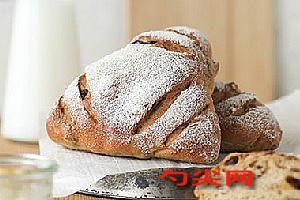 工藝:1.將桂圓干提前一晚用紅酒浸泡,核桃仁用150℃烤10分鐘左右,掰成小塊備用。2.參照“液種面包制作流程”,將液種原料里的酵母在水中化開后,加入面包粉,使用刮刀拌勻,面團室溫發酵至原來的2倍大后,放入冰箱冷藏16小時以上。3.將除黃油、果干以外的主面團原料和液種放在一起,揉至面團表面光滑,能拉出比較厚的膜。4.加入黃油,揉至擴展階段,面團能拉出較薄且不易破的膜,加入果干揉勻。將面團放在溫暖處進行基礎發酵。5.基礎發酵結束后,將面團平均分成2份,光滑面朝下,有收口的一面朝上,自上、下各1/3處向內折,讓面團光滑面朝上,蓋保鮮膜,松弛15分鐘。6.面團松弛時,開始制造蒸汽的準備工作:取一烤盤盛滿石子,放在烤箱上層,以230℃預熱烤箱。7.將松弛后的面團光滑面朝下,有接口的一面朝上,輕拍成長方形,四角向內折成菱形。8.將面團折起來,其中一角要稍短于另一角,兩角并非齊平。9.將短的一角放在下面,輕壓邊緣收好口。10.將面團排在另一烤盤上,蓋保鮮膜,在溫暖處進行最后發酵。11.最后發酵大約30分鐘,至原來的約2倍大后,在面團表面篩黑麥粉,割口。12.將盛面團的烤盤送入烤箱中下層,立即往石子上倒約300毫升開水,并迅速關上烤箱門。13.5分鐘后撤去盛石子的烤盤,轉200℃,繼續烘烤約15分鐘。14.出爐后將面包移至烤網上晾涼。