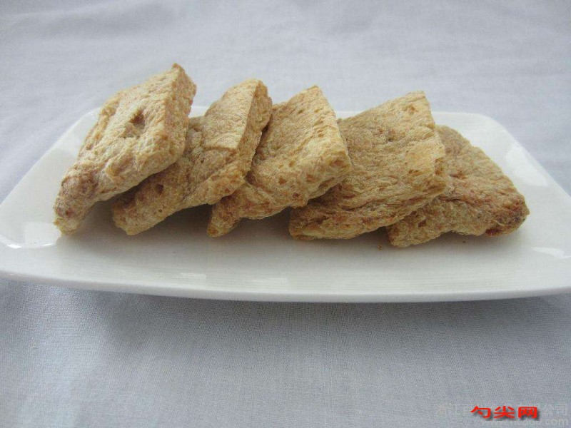 工藝:配料豬肉100kg,蛋清35kg,鹽3kg,淀粉5kg,面粉5kg,白糖2kg,胡椒粉0.15kg,蔥1kg,姜0.5kg,香精0.3kg,面包屑適量,富磷聯C0.1kg。糊的配方面粉40%,淀粉40%,大豆蛋白粉40%混勻一拌餡一肉餅成型一涂抹糊一掛面包屑-一油炸(180℃,5min)一成品,用大豆組織蛋白復配物制作肉餅時,最適添加量為30%,同時應添加肉味香精以掩蓋豆味,提高肉的風味,這樣制得的產品在感官上與純肉制品無明顯差異。