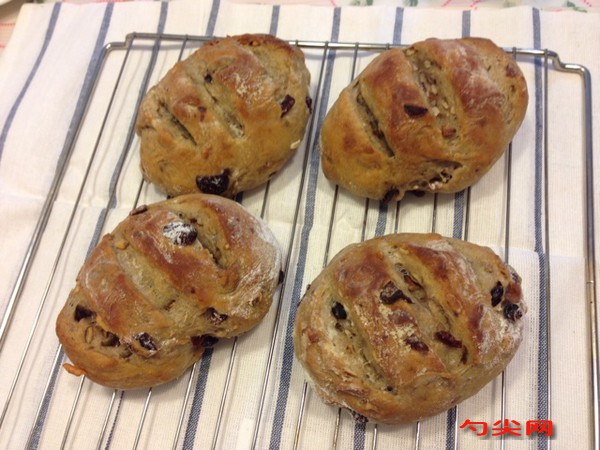 工藝:1.制作紅茶牛奶:將200克牛奶煮沸后關火,加入2克打成末的紅茶,蓋上蓋子,放涼備用。2.參照“和面流程”,將除黃油和蔓越莓干之外的面團原料放在一起,揉至面團表面光滑,能拉出比較厚的膜。3.加入黃油,揉至完全階段,面團能拉出薄且不易破的膜,再加入瀝干的蔓越莓干揉勻。4.參照“直接法面包制作流程”,將面團放溫暖處進行基礎發酵。基礎發酵結束后,將面團平均分割成2份,滾圓,蓋保鮮膜,松弛15分鐘。5.面團松弛時,開始制造蒸汽的操作:取一烤盤盛滿石子,放在烤箱上層,以230℃預熱烤箱。6.將面團自中間向兩頭搟成橢圓形,翻面后自上、下各1/3處向內折,然后對折,用掌根壓緊接口處。7.將面團搓長,一頭用搟面杖壓扁,另一頭搭上來,用壓扁的部分將搭過來的部分包起來,并捏緊接口處。8.將面團排在另一烤盤上,蓋保鮮膜,在溫暖處進行最后發酵。9.最后發酵大約30分鐘,至原來的約2倍大后,在面團表面篩黑麥粉,用剪刀在面團中間剪數道開口。10.將盛面團的烤盤送入烤箱中下層,立即往石子上倒約300毫升開水,并迅速關上烤箱門。11.5分鐘后撤去盛石子的烤盤,轉200℃,繼續烘烤約15分鐘。12.出爐后將面包移至烤網上晾涼。