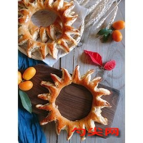 工藝:1.參照“和面流程”,將除黃油、糖漬橙皮丁和核桃仁以外的面團原料放在一起,揉至面團表面光滑,能拉出比較厚的膜。2.加入黃油,揉至完全階段,面團能拉出薄且不易破的膜,加入糖漬橙皮丁和核桃仁揉勻。3.參照“直接法面包制作流程”,將面團放溫暖處進行基礎發酵。基礎發酵結束后,將面團平均分割成4份,滾圓,松弛15分鐘。4.將面團搟成圓形,翻面后放上奶酪餡,收好口,松弛5分鐘。5.將松弛后的面團拍扁,排在烤盤上,冷凍15分鐘。6.將冷凍后的面團光滑面朝下,有收口的一面朝上,用刮板在面團上切4刀,將其平均分割成8份,邊緣不切斷。7.將面團切開的部分向外翻開后,放在另一烤盤上,用剪刀將每個尖角再平均分成2份,整形,放在溫暖濕潤處進行最后發酵。8.最后發酵結束后,表面刷全蛋液,將面團放入預熱至180℃的烤箱,中層,上下火,烤15分鐘。9.出爐后將面包移至烤網上晾涼。
