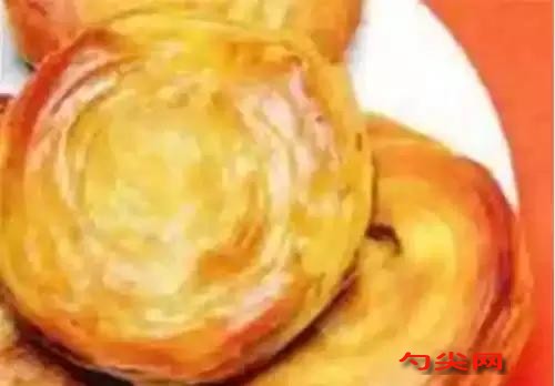 工藝流程:取白面0.7斤,加入油0.3斤和適量的食鹽,拌成酥子備用。取白面1.8斤,加入適量的溫開(kāi)水,和成面團(tuán),作為起面。將起面放置一段時(shí)間,讓其稍微發(fā)酵。將剩余的8.2斤白面和面欣酥A拌勻加入適量的溫開(kāi)水,和成面團(tuán)。將起面加入主面團(tuán)中,撒上少許堿面,揉勻至面團(tuán)光滑。將面團(tuán)做成細(xì)條,撕成25個(gè)小塊。拿一塊面,用手推開(kāi)成薄片,抹上酥子。將抹上酥子的面片卷起來(lái),并再次卷回來(lái),形成螺旋狀。按開(kāi)搟開(kāi)面塊,翻轉(zhuǎn)面塊,在另一面也抹上油。預(yù)熱鏊子至燙手時(shí),將面塊放上。當(dāng)面塊的皮被燙住時(shí),從中切成兩半,面子向里。烤到八成熟時(shí),翻轉(zhuǎn)面塊,再烤一會(huì)兒,直至兩面都烤至金黃且熟透。