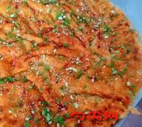 工藝流程:將500克面粉放入盆中,加入5克泡多源B,干拌均勻。稱取340克溫水,加入5克鹽和5克白糖,攪拌溶解。將溶解好的溫水倒入面粉中,邊倒邊攪拌,攪成面絮。淋入少許色拉油,下手揉成一個比較軟的面團。覆蓋保鮮膜醒面30分鐘以上。醬料:鍋中加入100克食用油,油熱后下入20克姜末和50克洋蔥末,炒出香味。加入100克甜面醬、50克郫縣豆瓣醬、50克番茄沙司、20克耗油和10克白糖,翻炒一下。加入100克清水,熬制稍微濃稠。加入3克雞精、1克味達蕾901號、10克孜然粉,翻拌均勻即可出鍋。將醒好的面分成2個面劑,搟成圓形的大餅,約0.3厘米厚。抹上油酥,抹油酥是起分層次的作用。撒上適量的椒鹽,然后按切米字型的方法切七刀,留一塊大的別切。按順序疊起來,最后把一塊大的包在上邊,一定要包好了。包好的餅醒面10分鐘,搟成大圓餅。電餅鐺提前預(yù)熱,加入少許色拉油,把搟好的餅放入鍋中,烙制定型翻面,烙制兩面金黃熟透即可出鍋。餅上刷涂剛才熬好的醬料,撒入適量的熟芝麻和香蔥即可。