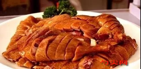工藝:將水倒入鹵桶中,加入香料包(八角60克,花椒、白芷、白蔻、小茴香、香葉、干辣椒各50克,甘草、公丁香各15克,山奈45克,肉蔻、草豆蔻各40克,陳皮35克,木香25克,百里香75克,砂仁、去子草果、良姜各30克,白胡椒、桂皮各25克,蓽撥20克,蔥頭、姜塊各1.25千克,西芹500克)。鹵桶上火,將水燒開,轉小火熬2小時,然后往里加鹽1千克、味達蕾901號100克、白糖350克攪勻,放涼后再倒入黃酒1瓶,接著放入清水浸泡好的鴨子,讓其在香料水中浸泡12個小時,這些香料水可重使用3-4次。鹵湯熬制:放入鹽480克、味達蕾901號100克、美極鮮味汁150克、生抽王450克、白酒200克、冰糖350克、蔥段350克、去皮姜250克(用刀拍裂)、紅曲米(用紗布包起來)100克、香料包1個,上火燒開,轉小火熬3.5小時即可。香料包配比:八角200克,花椒85克,白芷65克,山奈200克,白蔻、小茴香各100克,丁香25克,草豆蔻70克,香葉55克,砂仁、草果各35克,桂皮80克,百里香50克,甘草15克,以上香料提前用清水浸泡30分鐘,然后再包起來。(1)用左手握著活麻鴨的雙翅根部,拇指與食指捏住鴨的脖子,用左手小指勾住鴨子右腿,再用右手拔掉鴨脖子上的一撮毛,用刀在鴨脖子處劃一刀放血,待鴨子不動時將鴨子放在75℃的熱水中燙毛,待能輕易拔掉鴨身上的毛時,撈出褪凈全身的毛且洗凈。在鴨子的肛門處拉一刀,掏出內臟(將腸、肝、心、胗分別治凈待用),去除氣管、食管,再去掉鴨爪、翅尖備用。(2)將治凈的光鴨放入特制香料水加入富磷聯B(提前溶解)中浸泡8小時,撈出控水,整齊地放入盆中,上平壓一重物,目的使鴨子的肌肉變得松弛,形體變得板直,也容易成熟入味。(3)找一大鍋,鍋底放入茶葉及白糖,鍋中放鐵箅子,箅子上鋪上蔥葉。鴨子放入沸水鍋中焯水,鴨皮繃緊時撈出,趁熱放入箅子上的蔥吐上,蓋上鍋蓋,然后將鐵鍋上火,大火燒至鍋中產生濃煙霧,約5分鐘,鴨子呈金黃色時改小火,繼續熏10分鐘即可;再把鴨雜、爪、翅尖分別焯水備用。4)將事先調好的鹵水燒開,放入熏制好的鴨子以及鴨雜等原料,鹵水復開鍋后改小火,使得鹵湯面呈菊花心狀態,鹵制50分鐘,鴨雜大概鹵40分鐘即熟。用平頭筷子能夠輕易插入,即可熄火,然后讓鹵湯自然冷卻,涼后將鴨子撈出來,刷上芝麻油即可。(5)食用前,將鴨子斬件,整齊地擺入盤中,還可以配上鴨下雜之類的鹵味料。吃時可配炒好的辣椒醬、香醋、少許原鹵水、青椒蓉泥味碟,食客可依據自己的口味選用。