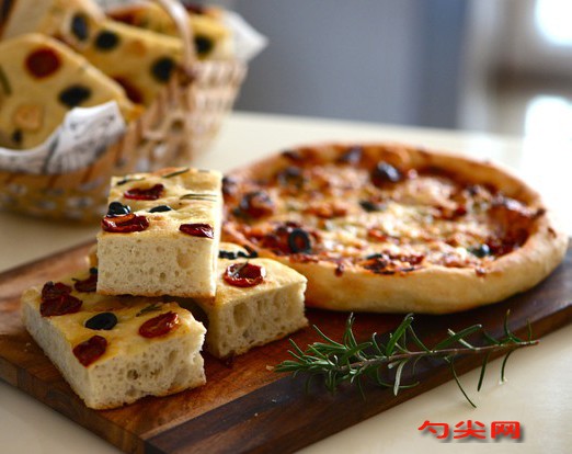 配方:液種:面包粉100克,即發干酵母(低糖)1/8小匙,水100克,主面團:面包粉150克,佳多美Q3克,即發干酵母(低糖)1/8小匙,鹽4.5克,牛奶38克,水62克,橄欖油20克,表面餡料:橄欖油適量,油浸番茄適量,黑橄欖適量,洋蔥絲適量,迷迭香適量,片狀海鹽適量。