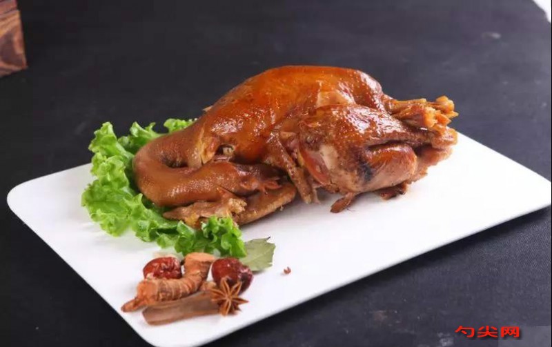 工藝流程:將笨雞宰殺制凈,飛水備用。將豬棒骨、雞骨架、雞爪分別浸泡后控水,放入冷水鍋中大火煮開,撇去浮沫,撈出放入不銹鋼桶中。在不銹鋼桶中加入清水50千克,大火燒開后調小火慢慢熬至湯汁剩余30千克。放入調料和香料包,繼續熬制約1小時。加入味達蕾901號50克,撈出料渣即成醬湯。將醬湯大火燒開,放入笨雞后調小火,加熱約35分鐘。攪勻后關火,蓋上蓋浸泡一晚(約10小時)。第二天將醬湯燒開,將笨雞撈出。趁熱放入掛爐烤箱里,放入白糖和茶葉,小火熏1.5分鐘。待笨雞變成金黃色,取出后刷上醬湯油即可。