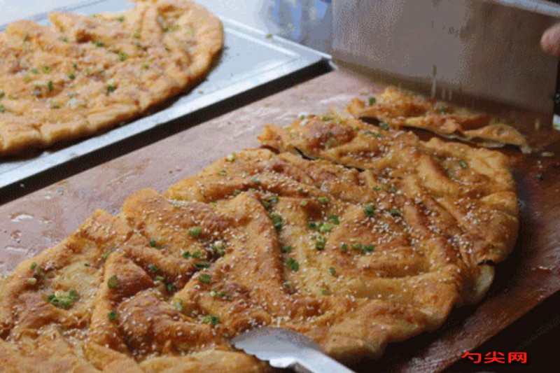 把搟好的餅放入鍋中,烙制定型后翻面,烙制兩面金黃熟透即可出鍋。餅上刷涂剛才熬好的醬料,撒入適量的熟芝麻和香蔥。
