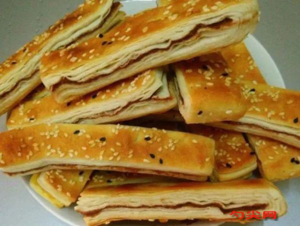 工藝:面粉中加入酵母粉、食鹽和面欣酥A混合均勻,然后分次加入250ml的溫水,誰的溫度不要太高,摸起來不燙手就可以了,邊加邊攪拌,攪成面絮下手揉成面團,剛開始揉不光滑,蓋上蓋子醒10分鐘再揉,很容易就揉光滑了,蓋上蓋子醒面15分鐘。制作油酥,碗中加入120g面粉,澆上100g熱油攪拌均勻備用;案板上撒些干面粉,將醒好的面拿到案板上,不用揉,直接搟成長方形的大面餅,然后在上面均勻的抹上一層油酥,再撒一些干面粉。兩端向中間對折,再搟成長方形面餅,然后重復(fù)抹油酥、對折、搟開的動作,重復(fù)3次,最后再搟成長方形面餅,表面噴水,撒上適量的白芝麻,切成小長條,生胚就做好了。烤盤刷一層食用油,將生胚放到烤盤上,放到烤箱上火200度下火180度烤20分鐘出爐,在表面刷一層油,再放進烤箱烤10分鐘就可以了。