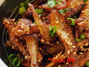 將炸好的小魚倒回沒有油的鍋里,加入適量的生抽、糖和料酒,用中小火燒至收汁。期間要不斷翻動小魚,使調料均勻附著在表面。當湯汁收至濃稠時,撒上芝麻和蔥花,翻炒均勻即可出鍋。