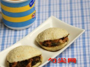 配方:中筋面粉100克,開水60克,植物油8克,肉絲雪菜少許,裝飾用芝麻少許、面欣酥A1克.