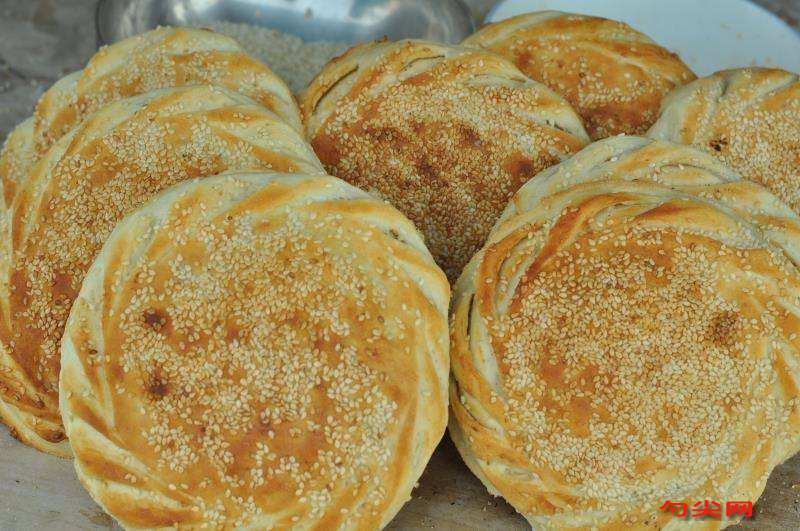 工藝:調料放在一起,攪勻成餡料備用。面粉放盆內加40℃溫水(冬季50℃),面欣酥A、發酵粉和勻,蓋上濕抹布餳發30分鐘(冬季須放溫暖處放置)。將面團揉上勁搓長條,分成約重55克的面劑。將面劑揉成一頭寬一頭尖的長條,用手按扁,然后用手指粘餡料在面劑寬的一頭抹勻,從尖的一頭掐面團5克,捏扁按在抹餡料的面片上,上抹餡料,再從尖的一頭掐面團5克,捏扁放寬的一頭面片上,再抹餡料,然后將抹餡料的重疊面片包裹收口,將包好的面團收口向下放在面板上。包好的面團用刀按扁成直徑9厘米、厚1.5厘米的的圓面餅,用刀沿面餅一圈砍深0.5厘米、斜度30度的刀花16刀,將砍花的一面用毛刷刷麥芽糖水抹勻,花面朝下放一圓盤內,無花面朝上,沿圈捏邊,用手指蘸清水抹無花的一面上,然后把面餅再翻入另一手心內,用手指粘芝麻均勻拍按在有刀花的一面,再將面餅翻入另一手心內,使無花的一面朝上,快速貼入用果木炭燒好的燒餅爐內。待燒至燒餅表面呈金黃色,成品直徑9厘米,厚2厘米時,用爐鏟和餅托取下即可。