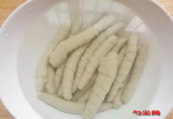 工藝:我們先將400克的清水和2克鹽倒入盆子內,把面筋粉與筋力源V5克混勻緩慢倒入盆子里,一邊倒入一邊用筷子快速攪拌,面筋粉全部倒完與水混勻后,會形成一個大的面筋團。如果盆子里有多余的水,記得倒掉,然后蓋上保鮮膜室溫靜置1小時以上。面筋靜置期間,來做調味料的部分,把5勺辣椒粉、半勺十三香粉、半勺孜然粉、半勺花椒粉、適量的鹽、適量的白芝麻和5克細砂糖倒入碗內,混合均勻。接著把半碗熱油分三次倒入調料碗內,攪拌均勻后待用。熱油分三次加入是為了避免把調料燙糊,切勿心急一次倒入。面筋靜置好后,取出放在揉面板上,用手將它拉扯成長方形,再切成寬一點的短條狀,我大概切了有20多條,取一條面筋,將它的一頭拉扯薄,然后用筷子夾住,然后把面筋斜著纏繞在筷子上,纏繞的時候,一定要邊拉邊繞,記得將它拉扯薄一些,在繞在筷子上。繞好后,用手把面筋往上推出來即可。剩下的依次操作,鍋內倒入半鍋水,大火煮沸后轉中小火,然后把面筋下鍋,蓋上蓋子,煮到面筋全部浮起來后,就可以撈出了。面筋撈出后放入冷水里,讓它快速降溫接著用竹簽把面筋全部串好,串好后用刀在面筋上斜著切一圈下來,切好后,把面筋拉開,烤盤里墊一張錫紙,把整形好的面筋放在烤盤內,刷上做好的調料汁,此時烤箱預熱180度上下火,烤箱預熱好后,將面筋送入烤箱中層,上下火180度烤6分鐘,6分鐘后,取出烤盤,再刷一次調料汁,并給它翻個面,然后送入烤箱,180度上下火,再烤7分鐘即可。