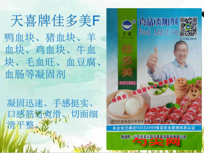 ★商品名:天喜牌佳多美F型 產(chǎn)品名稱:佳多美牌復配抗氧化凝固劑 型號:JDM-F 本品按照《食品安全國家標準 食品添加劑使用標準GB2760》及補充規(guī)定的品種、應用分類、使用范圍、最大使用量、殘留量等科學組方,并且按照《食品安全國家標準 復配食品添加劑通則GB26687》精心配制而成。本品已經(jīng)通過食品生產(chǎn)許可,保障食品安全。用戶按照本說明的用法用量生產(chǎn)制作的其他食品(僅限畜禽血制品)(食品分類號:16.07)既不會超標也不會超量。
