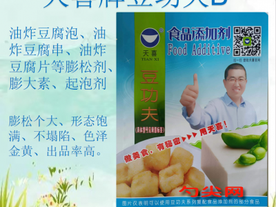 ★功能作用:[豆功夫B型]加工制作的油炸豆腐泡、油炸豆腐串、油炸豆腐片、油炸臭豆腐等豆類制品膨松個大、形態飽滿、不塌陷、色澤金黃、出品率高。 本品用于軟炸蝦仁掛糊膨松飽滿,用于油炸麻花、面泡、蝦味片等膨松個大、口感酥脆。 用于烤酥餅、千層餅、老婆餅、榴蓮酥、蛋撻皮等膨松酥脆。[豆功夫B型]還可用于豆腐泡、豆腐渣干、油炸豆腐、豆腐串、臭豆腐等。