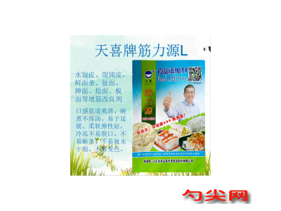 ★商品名:天喜牌筋力源L型 產品名稱:筋力源牌復配增稠水分保持劑 型號:JLY-L 本品按照《食品安全國家標準 食品添加劑使用標準GB2760》及補充規定的品種、應用分類、使用范圍、最大使用量、殘留量等科學組方,并且按照《食品安全國家標準 復配食品添加劑通則GB26687》精心配制而成。本品已經通過食品生產許可,保障食品安全。用戶按照本說明的用法用量生產制作的生濕面制品(食品分類號:06.03.02.01)、方便米面制品(食品分類號:06.07)、冷凍米面制品(06.08)既不會超標也不會超量。