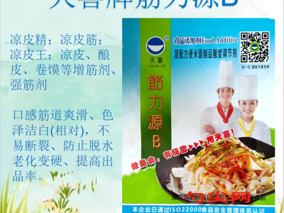 ★功能作用:[筋力源B型]制作的方便涼皮(相對潔白)、釀皮、非發(fā)酵面皮、非發(fā)酵自熟面皮、卷饃等方便米面制品、冷凍米面制品口感筋道爽滑、色澤潔白(相對),不易斷裂、防止脫水老化變硬、提高出品率。[筋力源B型]還可用于果蔬涼皮、涼皮卷饃、搟面皮等。