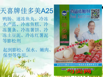 ★商品名:天喜牌佳多美A25型  產品名稱:佳多美牌復配酸度調節膨松劑   型號:JDM-A25  本品按照《食品安全國家標準 食品添加劑使用標準GB2760》及補充規定的品種、應用分類、使用范圍、最大使用量、殘留量等科學組方,并且按照《食品安全國家標準 復配食品添加劑通則GB26687》精心配制而成。本品已經通過食品生產許可,保障食品安全。用戶按照本說明的用法用量生產制作的發酵面制品(食品分類號:06.03.02.03)、方便米面制品(食品分類號:06.07)、冷凍米面制品(食品分類號:06.08)、預制肉制品(食品分類號:08.02)、熟制肉制品(食品分類號:08.03)、冷凍水產品(食品分類號:09.02.01)、冷凍魚糜制品(食品分類號:09.02.03)、雜糧罐頭(食品分類號:06.04.02.01)、其它雜糧制品(僅限冷凍薯條、冷凍薯餅、冷凍土豆泥、冷凍紅薯泥)(食品分類號:06.04.02.02) 、膨化食品(食品分類號:16.06)既不會超標也不會超量。