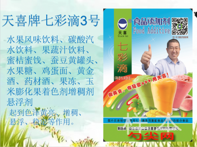 ★功能作用: 本品用于水果風味飲料、碳酸汽水飲料、果蔬汁飲料、蜜桔蜜餞、蠶豆黃罐頭、水果糖、雞蛋面、黃金酒、藥材酒、果凍、玉米膨化果、甘草金桔等冷凍飲品(03.04食用冰除外)、蜜餞類、堅果與籽類罐頭、可可制品、巧克力和巧克力制品(包括 代 可 可 脂 巧 克 力 及 制 品) 以及糖果、果蔬汁(漿)類飲料、生干面制品、風味飲料(僅限果味飲料)、配制酒、果凍、、大米小小酥(膨化食品)、膨化食品等,起到色澤黃亮、增稠、懸浮、穩定等作用,增強食欲。本品使用色素為天然提取物,放心使用。