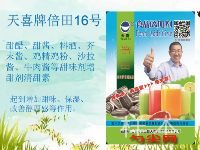 ★商品名:天喜牌倍田16型 產品名稱:倍田牌復配甜味劑16 型號:BT-16 本品按照《食品安全國家標準 食品添加劑使用標準GB2760》及補充規定的品種、應用分類、使用范圍、最大使用量、殘留量等科學組方,并且按照《食品安全國家標準 復配食品添加劑通則GB26687》精心配制而成。本品已經通過食品生產許可,保障食品安全。用戶按照本說明的用法用量生產制作的調味品(食品分類號:12.0)既不會超標也不會超量。