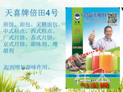 ★商品名:天喜牌倍田4型 產品名稱:倍田牌復配甜味劑4 型號:BT-4 本品按照《食品安全國家標準 食品添加劑使用標準GB2760》及補充規定的品種、應用分類、使用范圍、最大使用量、殘留量等科學組方,并且按照《食品安全國家標準 復配食品添加劑通則GB26687》精心配制而成。本品已經通過食品生產許可,保障食品安全。用戶按照本說明的用法用量生產制作的面包(食品分類號:07.01)、糕點(食品分類號:07.02)既不會超標也不會超量。