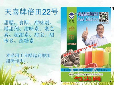 ★商品名:天喜牌倍田22型 產(chǎn)品名稱:倍田牌復(fù)配甜味劑22 型號:BT-22 本品按照《食品安全國家標(biāo)準(zhǔn) 食品添加劑使用標(biāo)準(zhǔn)GB2760》及補充規(guī)定的品種、應(yīng)用分類、使用范圍、最大使用量、殘留量等科學(xué)組方,并且按照《食品安全國家標(biāo)準(zhǔn) 復(fù)配食品添加劑通則GB26687》精心配制而成。本品已經(jīng)通過食品生產(chǎn)許可,保障食品安全。用戶按照本說明的用法用量生產(chǎn)制作的醋(食品分類號:12.03)既不會超標(biāo)也不會超量。