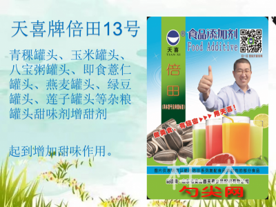 ★商品名:天喜牌倍田13型 產品名稱:倍田牌復配甜味劑13 型號:BT-13 本品按照《食品安全國家標準 食品添加劑使用標準GB2760》及補充規定的品種、應用分類、使用范圍、最大使用量、殘留量等科學組方,并且按照《食品安全國家標準 復配食品添加劑通則GB26687》精心配制而成。本品已經通過食品生產許可,保障食品安全。用戶按照本說明的用法用量生產制作的雜糧罐頭(食品分類號:06.04.02.01)既不會超標也不會超量。