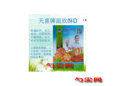 ★商品名:天喜牌面欣酥D型 產(chǎn)品名稱:面欣酥牌復(fù)配增稠膨松劑4 型號(hào):MXS-D本品完全按照《食品安全國(guó)家標(biāo)準(zhǔn) 食品添加劑使用標(biāo)準(zhǔn)GB2760》及補(bǔ)充規(guī)定的品種、應(yīng)用分類、使用范圍、最大使用量、殘留量等科學(xué)組方,并且按照《食品安全國(guó)家標(biāo)準(zhǔn) 復(fù)配食品添加劑通則GB26687》精心配制而成。本品已經(jīng)通過(guò)食品生產(chǎn)許可,保障食品安全。用戶按照本說(shuō)明的用法用量生產(chǎn)制作的裹粉、面糊、煎炸粉(食品分類號(hào):06.03.02.04)、油炸面制品(食品分類號(hào):06.03.02.05)、焙烤食品(食品分類號(hào):07.0)既不會(huì)超標(biāo)也不會(huì)超量。