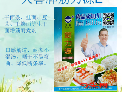 ★功能作用:[筋力源E型]制作的干面條、掛面、豆萁等生干面制品口感筋道、耐煮不混湯,曬干不易彎曲、降低斷條率。[筋力源E型]還可用于蔬菜干豆萁、機(jī)器軋蔬菜面條等。